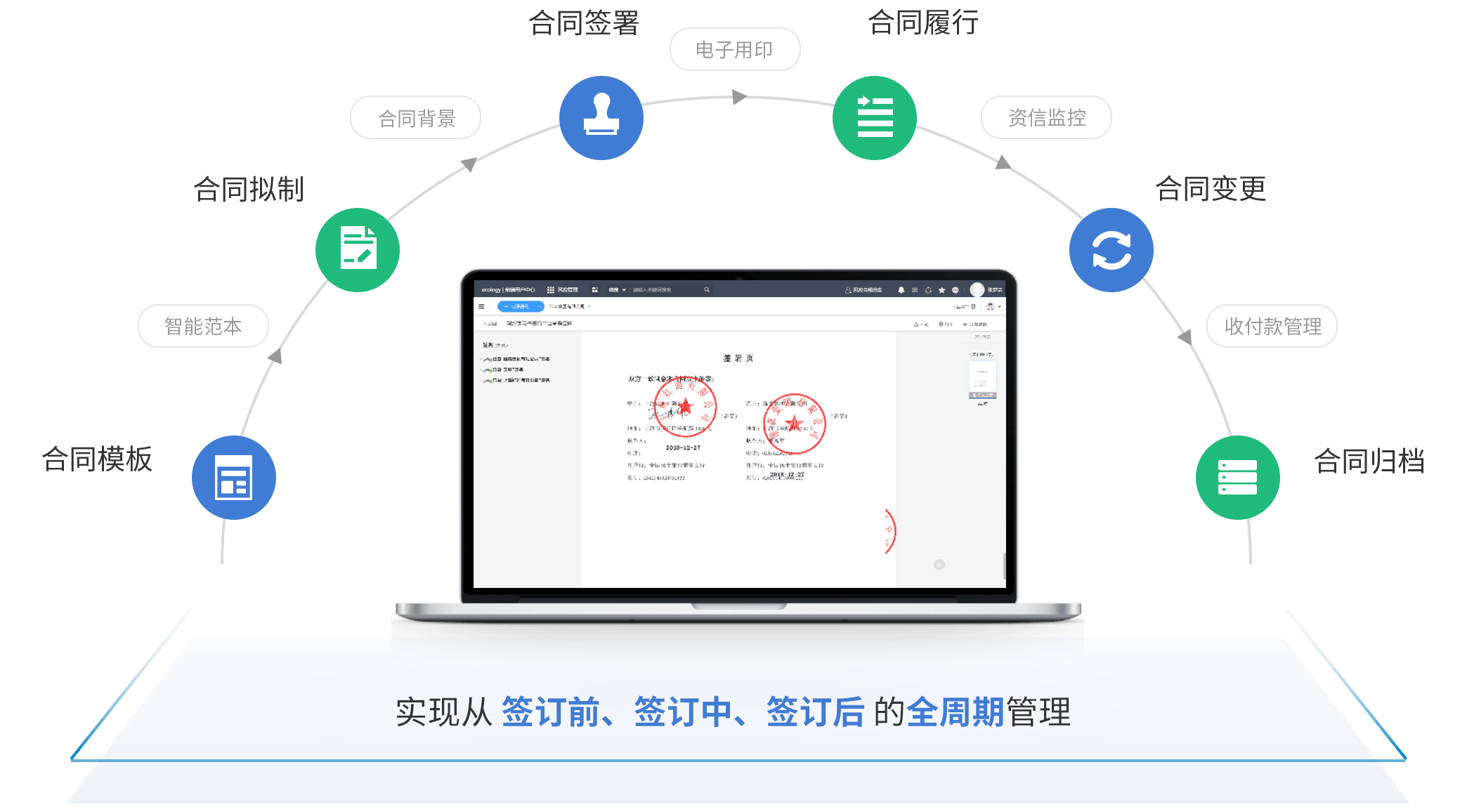 合同實現(xiàn)全程數(shù)字化管理,從合同起草、流轉(zhuǎn)審批、簽署用印、存證歸檔到履約過程中的變更、查詢、統(tǒng)計,整個合同管理過程實現(xiàn)全程數(shù)字化