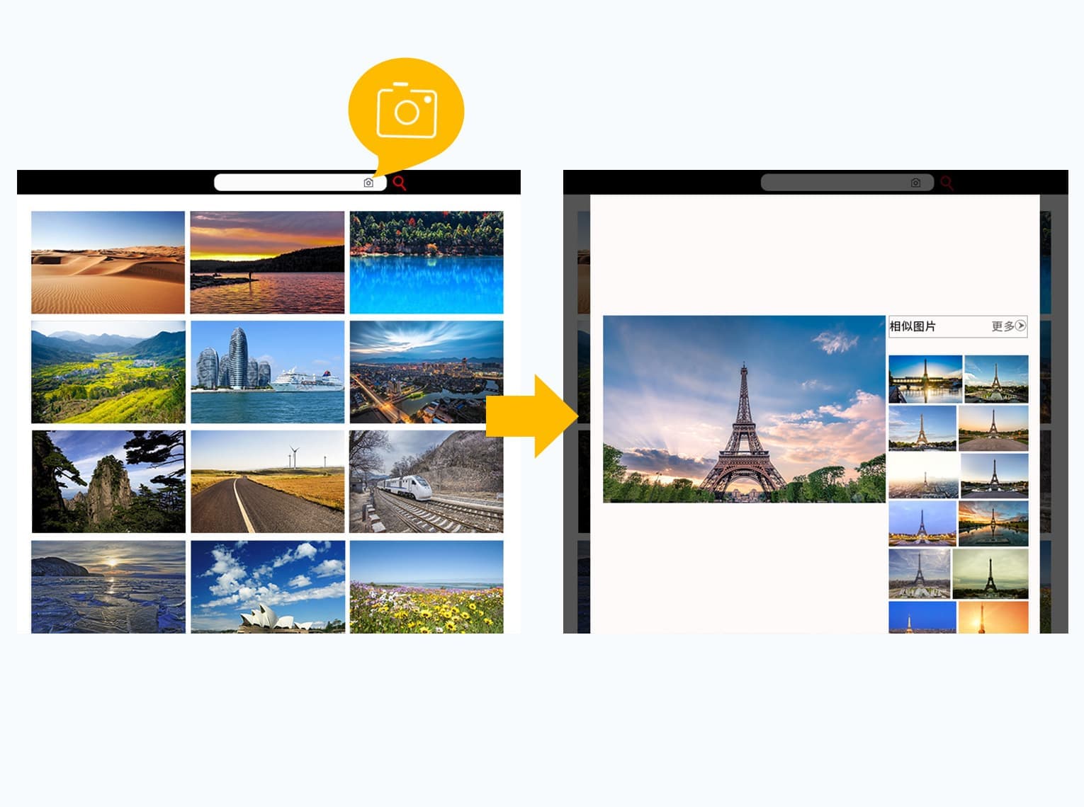 圖片分享和社交類網(wǎng)站通常有大量通用圖片供用戶搜索使用,利用圖像搜索服務(wù),可在云端快速構(gòu)建百億級圖像搜索引擎,提供以圖搜圖功能,提升用戶體驗。