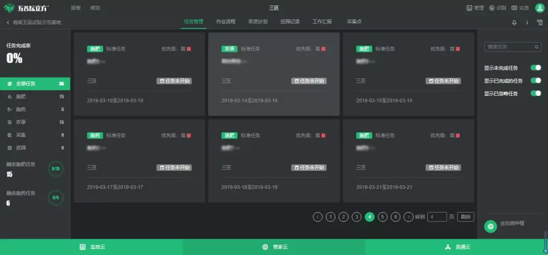 如今,五大村的蜜瓜基地在五谷耘立方標(biāo)準(zhǔn)化生產(chǎn)系統(tǒng)的管理下,井然有序地進(jìn)行著各項生產(chǎn)任務(wù),基層工作人員每天都會收到系統(tǒng)自動派發(fā)的農(nóng)事任務(wù)流程,以及基地管理員派發(fā)的臨時工作任務(wù),并且每完成一項任務(wù),工作人員在系統(tǒng)上直接匯報,基地管理員在系統(tǒng)中可以實時查看工作完成情況,及時掌握農(nóng)事進(jìn)度。