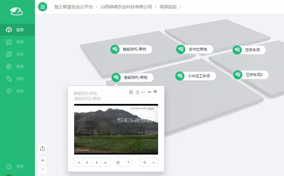 為了更好掌控農(nóng)產(chǎn)品種植以及加工過程,天潤(rùn)智力在綠德農(nóng)業(yè)的野菜基地、火棘基地以及加工車間分別安裝了360度高清攝像頭,用戶可以隨時(shí)隨地直觀了解基地情況,對(duì)現(xiàn)場(chǎng)農(nóng)作物生長(zhǎng)情況進(jìn)行實(shí)時(shí)動(dòng)態(tài)、靜態(tài)的監(jiān)控、記錄。用戶即便出門在外,也可以通過手機(jī)或者電腦登陸云平臺(tái)實(shí)時(shí)查看作物情況,指導(dǎo)員工開展種植與生產(chǎn)活動(dòng)。農(nóng)業(yè)生產(chǎn)變得更加自由自主們更加高效便捷。