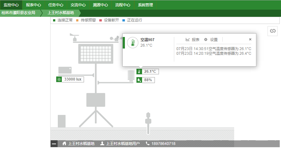 灌陽縣農(nóng)業(yè)局在該縣上王村水稻基地、小龍村葡萄基地、中秀村蔬菜基地分別部署了智慧農(nóng)業(yè)的監(jiān)控設(shè)備——空氣溫度傳感器、土壤溫濕度傳感器、土壤PH值傳感器、CO2 濃度傳感器等物聯(lián)網(wǎng)設(shè)備,以及高清攝像頭、相機(jī)等監(jiān)控設(shè)備,通過采集器將種植環(huán)境的各種數(shù)據(jù)采集上傳到云端,農(nóng)業(yè)局的農(nóng)技人員及其他管理人員通過手機(jī)、電腦就可以遠(yuǎn)程監(jiān)控種植現(xiàn)場。系統(tǒng)同時(shí)可以設(shè)定自動(dòng)控制程序,當(dāng)有異常情況出現(xiàn)時(shí),系統(tǒng)就會(huì)發(fā)送警報(bào)至管理員手機(jī),同時(shí)自動(dòng)啟動(dòng)設(shè)備開關(guān),自動(dòng)實(shí)現(xiàn)遠(yuǎn)程控制,解除異常狀況。比如,監(jiān)測到小龍村葡萄基地連續(xù)一周的空氣濕度超過80%時(shí),系統(tǒng)就會(huì)給葡萄管理員發(fā)送預(yù)警,提醒注意預(yù)防灰霉病等疾病;監(jiān)測到溫度接近35℃,系統(tǒng)就會(huì)自動(dòng)打開噴霧降溫,防止曬傷葡萄。同時(shí),系統(tǒng)還可以制定自動(dòng)化生產(chǎn)標(biāo)準(zhǔn)流程,這對農(nóng)業(yè)局在全區(qū)進(jìn)行各種作物的種植示范推廣具有非常大的作用。從源頭上保證產(chǎn)品品質(zhì),為“生態(tài)農(nóng)業(yè)品牌”奠定堅(jiān)實(shí)的基礎(chǔ),是灌陽縣農(nóng)業(yè)局的戰(zhàn)略目標(biāo)第一步。