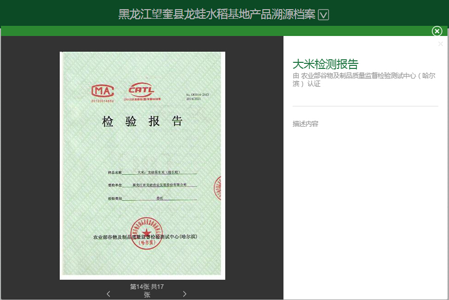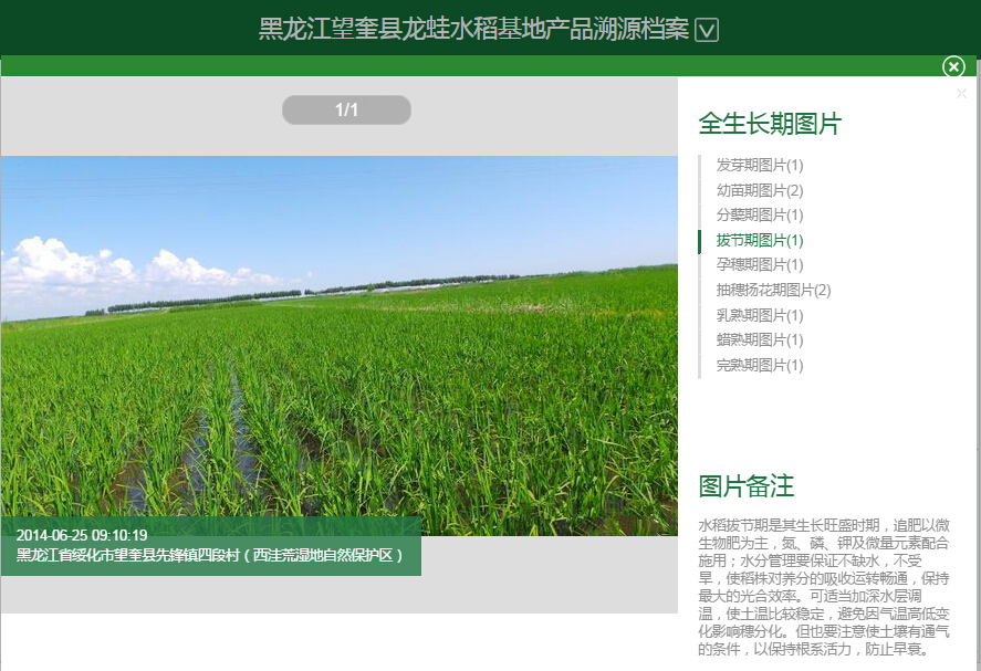 天潤智力農產(chǎn)品溯源系統(tǒng),給每一袋龍蛙大米制作了自己唯一的身份(二維碼),完整記錄這袋大米的品種、產(chǎn)地、種植、收割、加工、倉儲、質檢等全部信息,消費者只要掃描產(chǎn)品二維碼,就能快速地查看龍蛙大米的詳細信息。龍蛙農業(yè)同時配合使用天潤智力智慧農業(yè)監(jiān)控系統(tǒng),在每一位龍蛙客戶的手機里,都安裝了天潤智力智慧農業(yè)云平臺。從播種的第一天起,消費者就可以隨時隨地跟蹤生產(chǎn)過程,通過農場視頻、實時采集的種植環(huán)境數(shù)據(jù),了解黑土地的土壤溫度、空氣濕度、光照情況、大米的長勢,親歷生產(chǎn)全過程,真正做到全程掌控,提前預定,大幅提升用戶粘性。龍蛙大米利用農產(chǎn)品溯源平臺,在消費者和每一位龍蛙客戶心中,建立并展示了綠色、有機、安全的良好品牌形象。