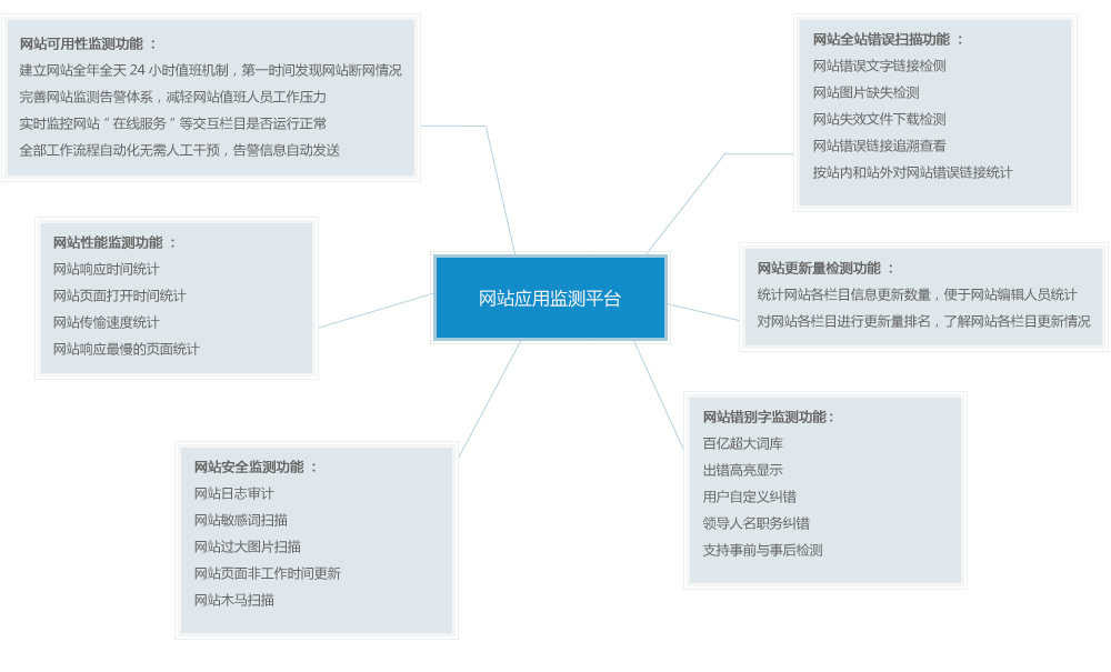 | 功能特點(diǎn) 網(wǎng)站無(wú)法訪問(wèn)、頁(yè)面突變、被掛木馬等異常第一時(shí)間自動(dòng)告警。 網(wǎng)站錯(cuò)別字、敏感詞檢測(cè),提升網(wǎng)站文字安全。-網(wǎng)站內(nèi)容維護(hù) 網(wǎng)站錯(cuò)誤圖片、錯(cuò)誤鏈接檢測(cè),提升網(wǎng)站質(zhì)量,增加網(wǎng)民滿意度。 網(wǎng)站過(guò)大圖片、過(guò)慢頁(yè)面檢測(cè),為網(wǎng)站性能優(yōu)化提供依據(jù)。 提高信息更新量,將網(wǎng)站群現(xiàn)有日更新量提高20%以上。 提升瀏覽點(diǎn)擊率,為各部門網(wǎng)站結(jié)構(gòu)設(shè)置提供依據(jù)。 |
