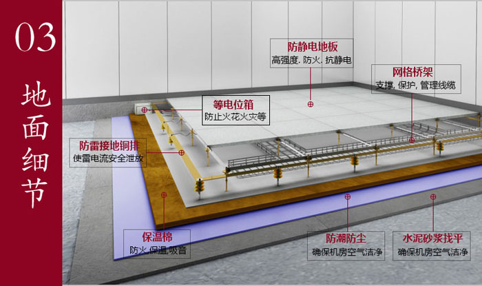 ( 1)地板采用高強(qiáng)度的抗靜電地板,它拆卸靈活、互換性能好,能提供靜壓風(fēng)庫,抗御靜電荷等優(yōu)點,可用于任何管線敷設(shè)集中,防止靜電產(chǎn)生的場所。 防止和消除機(jī)房的靜電積沉,是保證計算機(jī)安全可靠運行和消除操作人員安全心理障礙的主要技術(shù)之一,防靜電活動地板是實現(xiàn)這種技術(shù)的有效設(shè)施。2)因機(jī)房在精密空調(diào)的作用下處于恒溫恒濕的狀態(tài)下,鋪20mmPE防火保溫板有效地防止地板下結(jié)露現(xiàn)象的產(chǎn)生。 3)為防止止機(jī)房內(nèi)精密空調(diào)漏水事故,特要求增設(shè)防水墻一道及地漏,并在其四周鋪設(shè)漏水感應(yīng)設(shè)備能夠及時的發(fā)現(xiàn)水患的存在并避免水患的擴(kuò)大。)