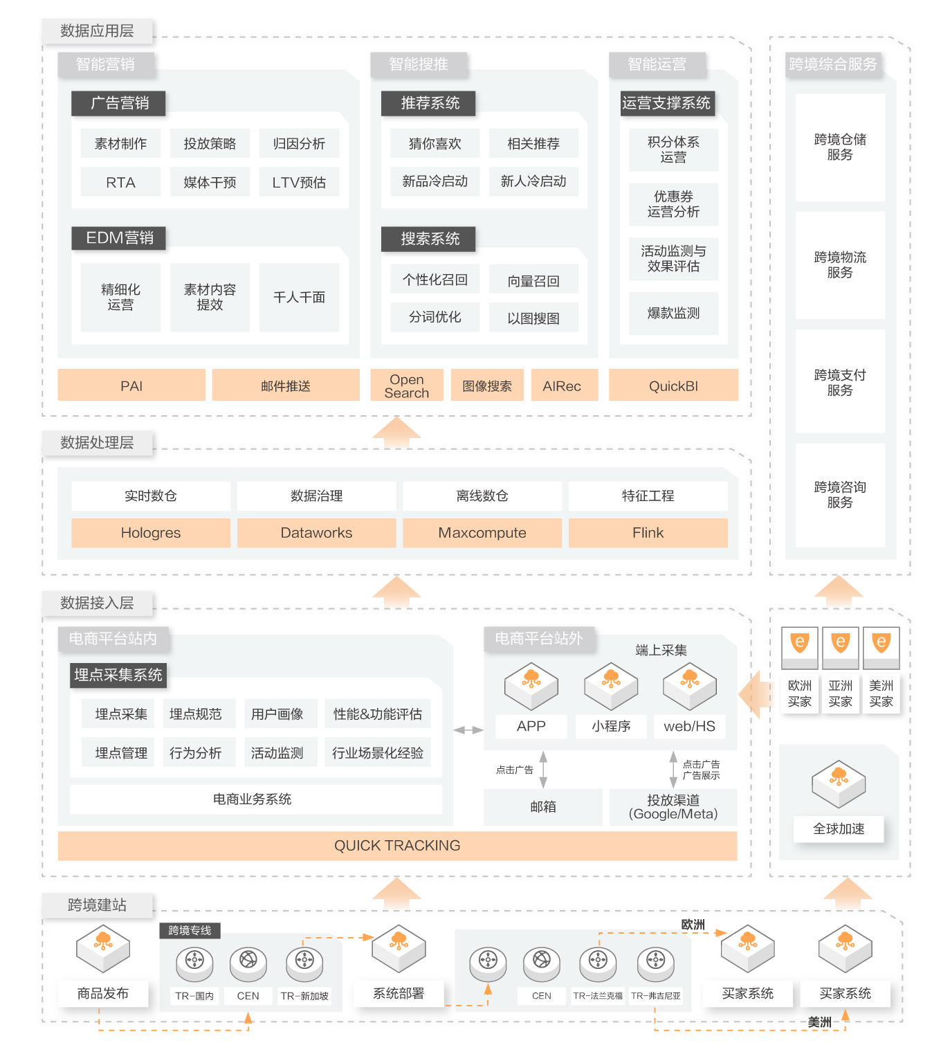 基于天潤(rùn)智力遍布全球的基礎(chǔ)設(shè)施和云原生服務(wù)快速構(gòu)建跨境電商平臺(tái)。使用開(kāi)箱即用的開(kāi)放搜索、智能推薦,圖像搜索服務(wù)提升全球用戶滿意度。通過(guò)智能營(yíng)銷方案提高流量運(yùn)營(yíng)效率,高效運(yùn)營(yíng)。
