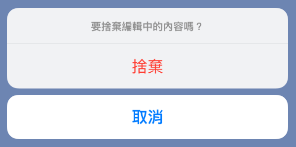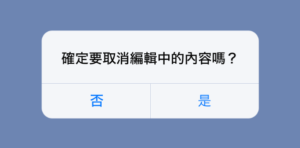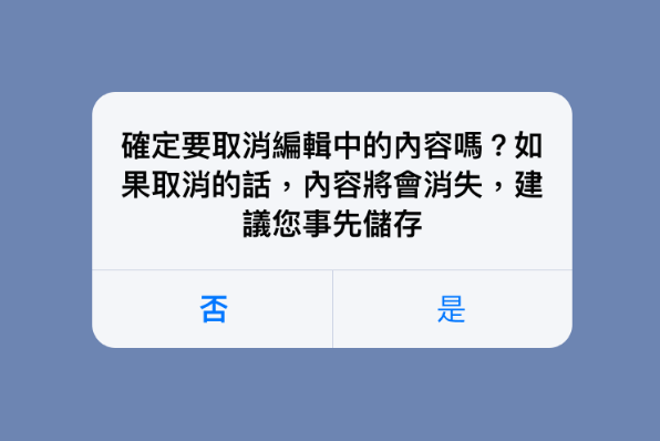 問(wèn)句確定要取消編輯中的內(nèi)容嗎?確認(rèn)是否要舍棄編輯中的內(nèi)容(兩個(gè)選項(xiàng))