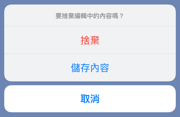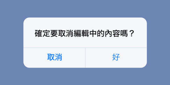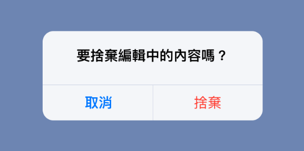 看過(guò)上面這些討論,我們可將這個(gè)警告框的說(shuō)明文字中的「確定要取消編輯中的內(nèi)容嗎?」改寫(xiě)成「要舍棄編輯中的內(nèi)容嗎?」
