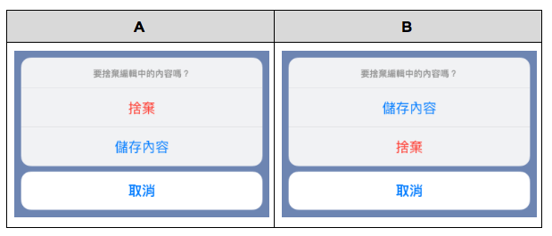 在 iOS 與 macOS 中,有「將表示同意的動(dòng)作放在右邊,表示不同意的動(dòng)作放在左邊」的定義,請(qǐng)遵守這個(gè)資訊的排列規(guī)則。但注意在 Windows 或者舊版的 Android 中,這個(gè)規(guī)則剛好是反過(guò)來(lái)的。