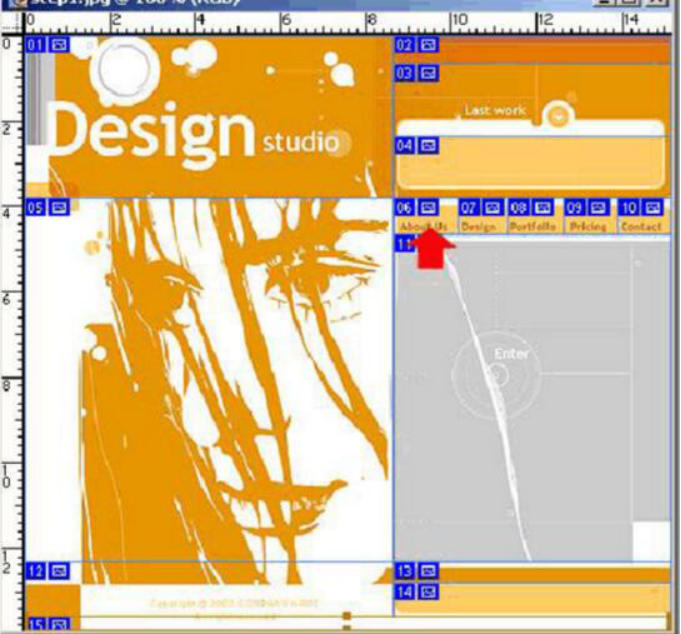 選擇工具板上的slice切片工具,先大刀闊斧的切上一番! 技巧:大面積的色塊單獨(dú)切成一塊,盡可能的保持在水平線上的整齊(這個(gè)問題你們?cè)诤竺娴闹谱黜?yè)面中深有感觸)切好的圖如下所示: