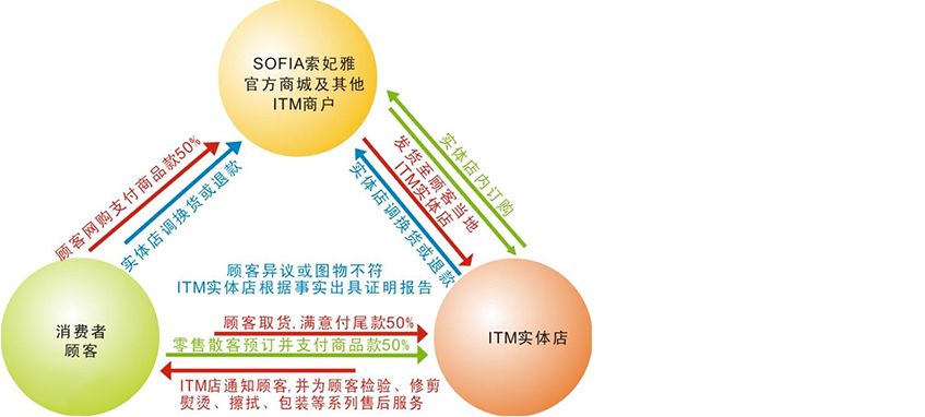 該模式的經(jīng)營難度較大,企業(yè)須具備“二元經(jīng)營思維”的戰(zhàn)略理念,因此,目前國內(nèi)僅青島本土品牌索妃雅一支獨(dú)大。ITM戰(zhàn)略認(rèn)為,當(dāng)前的商業(yè)競爭不再是同業(yè)的產(chǎn)品、服務(wù)、品牌等層面的競爭,而是信息化時(shí)代的變革推進(jìn)之爭,步入信息化時(shí)代的未來企業(yè)要面對(duì)“雙線競爭”即“線上與線下”兩大戰(zhàn)略層面。因此,在ITM戰(zhàn)略格局中,將線上經(jīng)營者認(rèn)證為ITM商戶,將實(shí)體店轉(zhuǎn)型升級(jí)為ITM服務(wù)店,使兩者的商品、價(jià)格、服務(wù)、溝通和信息同步運(yùn)行。如,所有B2B、B2C、C2C等經(jīng)營者認(rèn)證ITM商戶后,其在線上銷售的商品發(fā)貨至顧客指定的ITM服務(wù)店,服務(wù)店根據(jù)商戶線上承諾為商品進(jìn)行檢驗(yàn)、修整、熨燙、擦拭,重新包裝及出具《ITM證明報(bào)告》等一系列售前、售中服務(wù)。