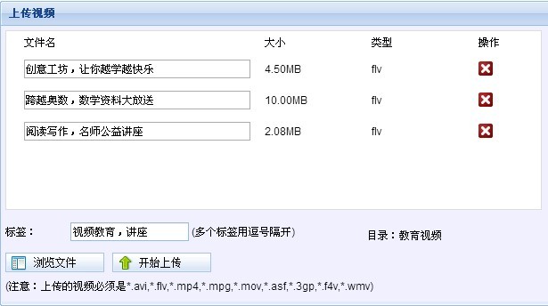 (1)在管理視頻界面中點(diǎn)擊“上傳視頻”,從彈出的對話框中點(diǎn)擊“瀏覽文件”,選擇本地的一個或多個視頻文件并點(diǎn)擊確定,選擇視頻分類,并為視頻填寫標(biāo)簽,如下圖;