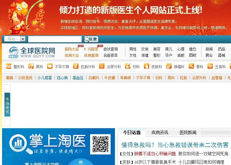 全球醫(yī)院網(wǎng)(www.QQYY.com)隸屬網(wǎng)健天下科技管理有限公司,經(jīng)過(guò)兩年來(lái)的前期籌備工作,全球醫(yī)院網(wǎng)(中文版)于2008年1月8日正式開(kāi)通。 全球醫(yī)院網(wǎng)(www.QQYY.com)是根據(jù)世界衛(wèi)生組織(WHO)提出的通力合作,增進(jìn)健康為服務(wù)理念而創(chuàng)辦的,以全世界人民盡可...